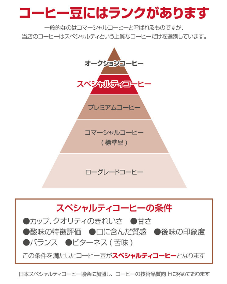 ※カップ・クオリティのきれいさ、甘さ、酸味の特徴評価、口に含んだ質感、風味特性・風味のプロフィール、後味の印象度、バランスの基準を満たしたもの